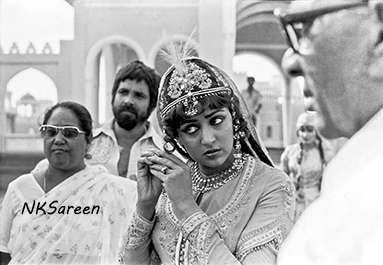 Hema Malini clicked by NK Sareen on the sets of ‘Razia Sultan’ (1983). You can see the faint image of Parveen Babi in the background.
