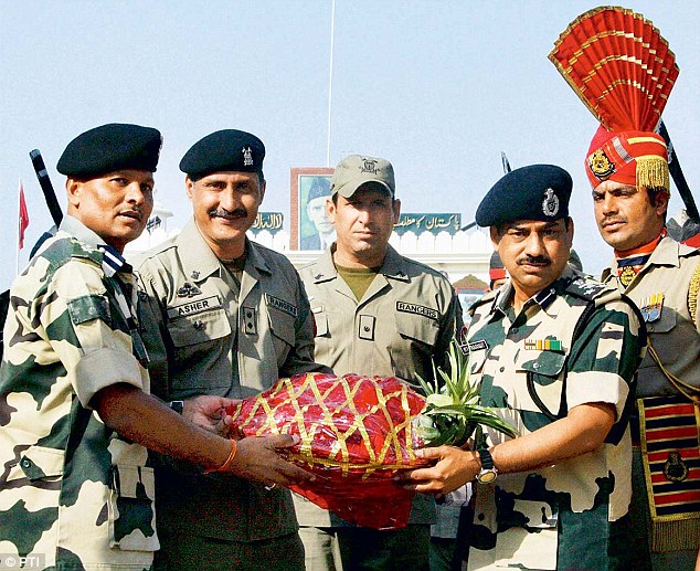 The BSF presents a sweets basket to Pakistani Rangers on the occasion of Eid-ul-Zuha at Wagha Border in Amritsar. Courtesy Daily Mail and PTI. Dated: August, 2013