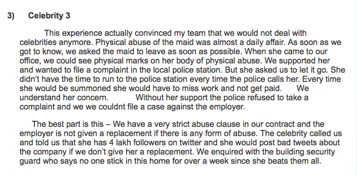 Screenshot of Anupam Singhal’s blog about a Bollywood actress routinely harassing and torturing her maids. His agency’s maid was one of her victims