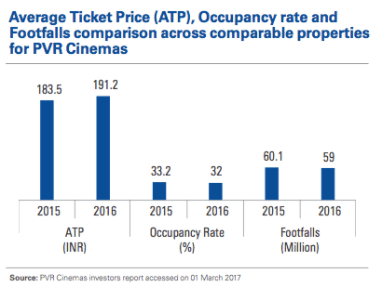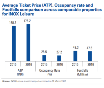 Screens and ticket prices are increasing at a decent pace and the number of Rs 100 crore plus films are remaining around the same, this clearly indicates that the number of people buying tickets is dropping steadily each year. The same is also indicated through the occupancy/footfall numbers of Inox and PVR, as above…