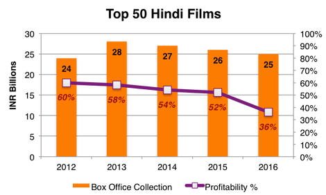 On top of that, there is a drastic reduction in profitability of these films. Box Office collections of the top 50 films have remained steady, but profitability has reduced to almost half.