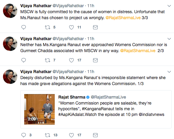 Like this time, she has dragged in State Women’s Commission chairperson Vijaya Rahatkar who tweeted that the Commission wasn’t involved in this controversy any way. Kangana said in the show that a Women’s body pursued her to drop the charges against Hrithik Roshan. Here are Vijaya’s tweets.