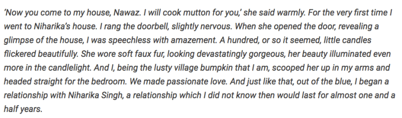 He describes in great detail how Niharika Singh ‘lured’ Nawaz into her bedroom which will give you a sense that Niharika was madly in love with him and desperately wanted to sleep with him.