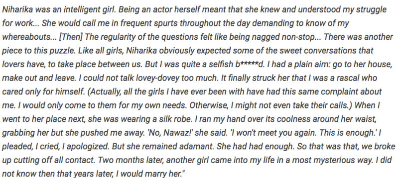 Nawaz is a brilliant actor but that doesn’t make him a better person. To narrate your torrid love story like this is without any concern doesn’t make you any better than the chai wala at my husband’s work.