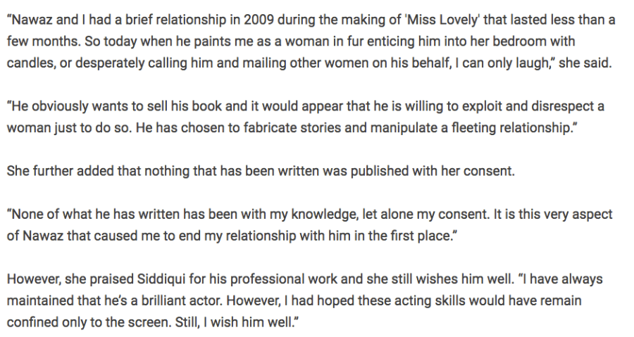 I have gone through several autobiographies by film stars in India and nobody has ever disrespected a woman like the way Nawaz has done to Niharika Singh.